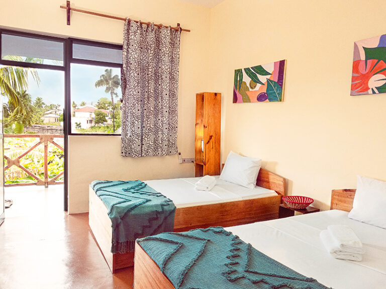 A bright, comfortable room with two twin beds, perfect for friends or travel partners. Enjoy cool air conditioning and a soothing natural agarwood scent, all just moments from Nungwi’s beautiful beach.